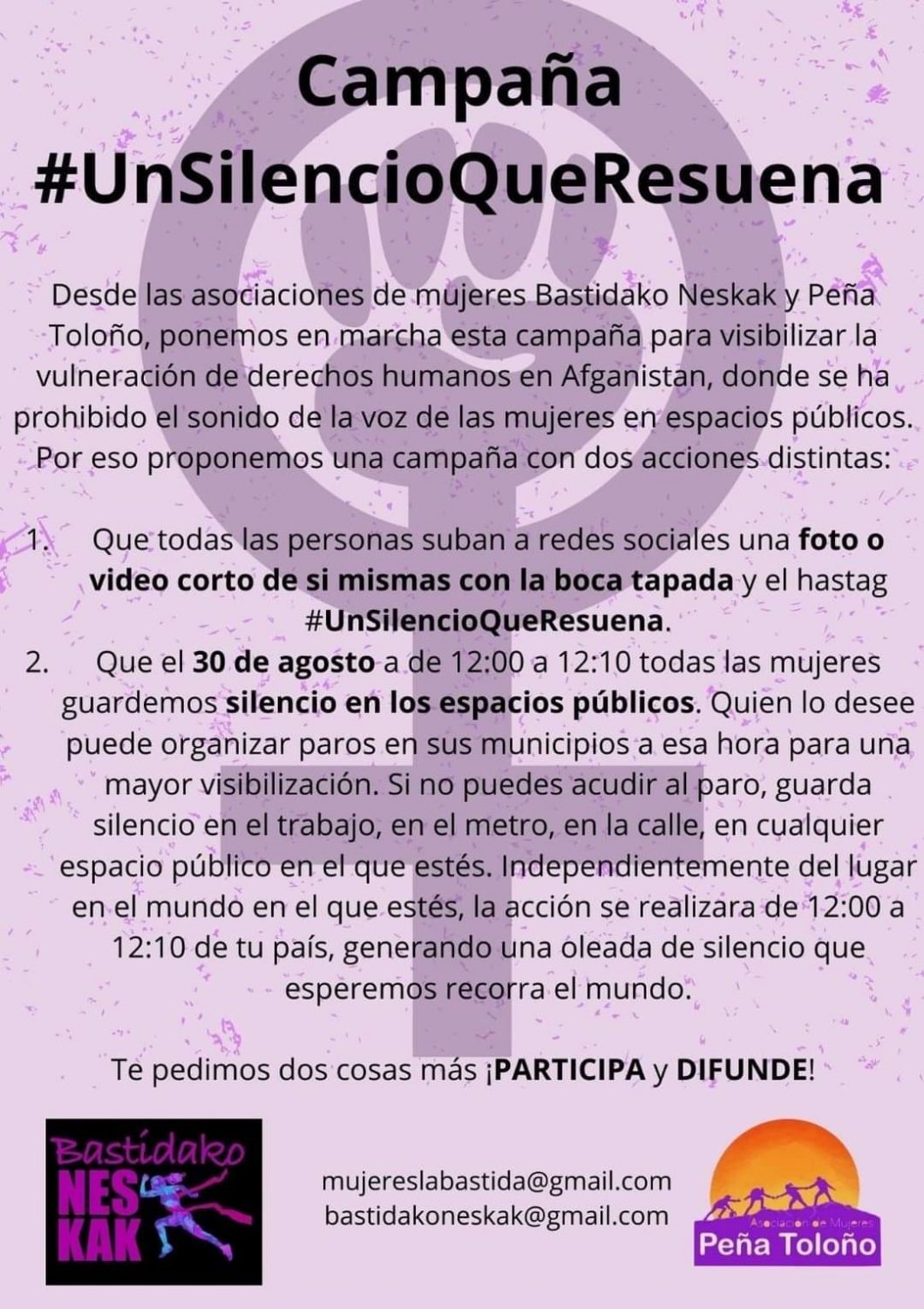 Este mes la Colectiva Portal de Igualdad se sumó a la Campaña#UnSilencioQueResuena, convocada por asociaciones de mujeres vascas, en protesta por la situación injusta que viven las mujeres y las niñas en Afganistán y que las hace vivir en unas condiciones intolerables sin respetar sus derechos más fundamentales. En la campaña de Facebook del día 30 de agosto participó Manola Roig Celda, componente de la Colectiva. Un día antes, el 29 de agosto, se publicó en varios periódicos el artículo “Sin voz y sin palabra”, firmado por Amparo Zacarés, componente también de la Colectiva. De este modo, el artivismo en defensa de las mujeres forma parte de nuestra agenda y línea de actuación.