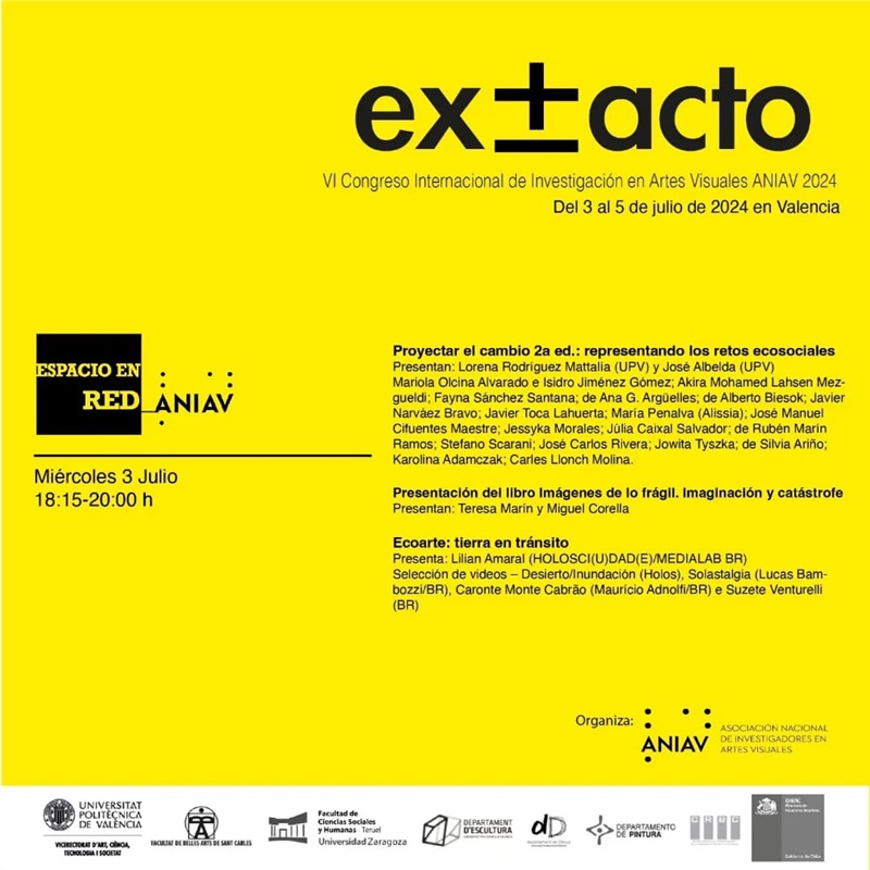 - El 3 de julio tuvo lugar VI Congreso Internacional de investigación en Artes Visuales ANIAV 2024, donde se trataron temas relacionados con la crisis climática, acciones artivistas y entornos digitales. En el Congreso participaron las componentes de la Colectiva Portal de Igualdad: María Penalva (Alissia) en la Proyectar el cambio 2ªed: retos ecosociales y Lilian Amaral y Bia Santos, junto a Liliana Fracasso, en el apartado Ecoarte: tierra en tránsito, con el Grupo Internacional de investigación-creación en arte, ciencia y tecnología en red que presentaban HOLOSCI(U)DAD(E)/MEDIALAB BR.