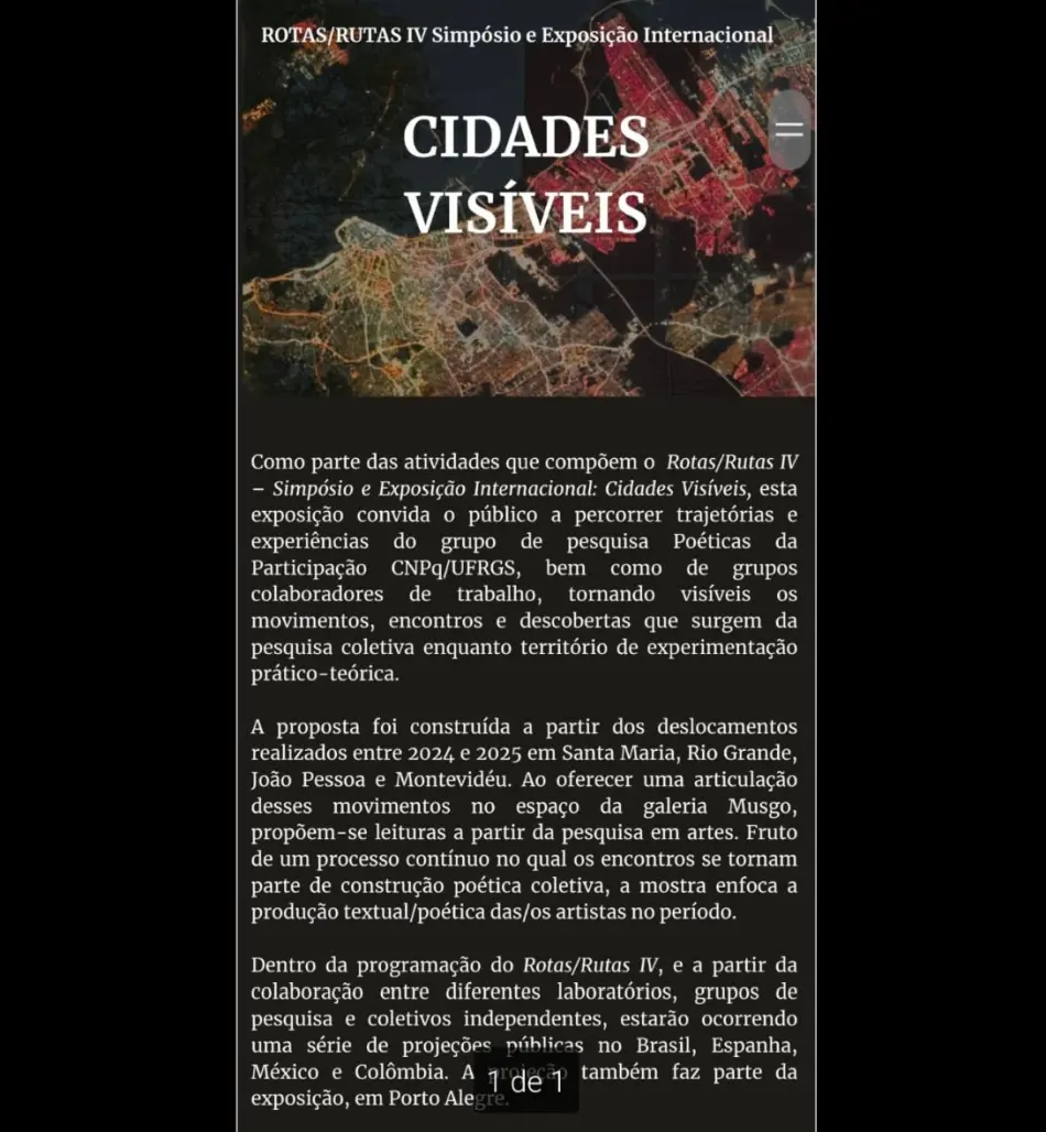 - Liliam Amaral, componente de la Colectiva, presentó Ciudades Visibles como parte de las actividades que componen la Rutas IV Simposio y Exposición que invita al público a recorrer las trayectoras y experiencas del grupo de investigación Poéticas de Participación CNPq/UFRGS. Pudo contemplarse en la galería Musgo y forma parte de la Cátedra Nómada/USP que actúa a través de colectivos independientes en Brasil, España, México y Colombia. Desde Brasil, Liliam Amaral, comisarió la exposición ECOARTE: Geopoéticas del Sur: Arte, Género y medio ambiente. Fue inaugurada el pasado 22 de noviembre y reunió a artistas participantes de Brasil, Colombia y Costa Rica